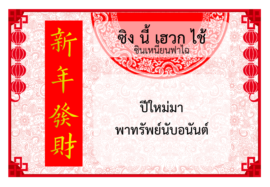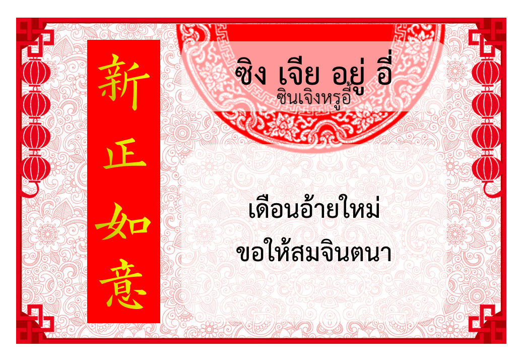 新正如意,新年发财。 [xīnzhèngrǔyì xīnniánfācái] ปีใหม่ขอขอให้ร่ำรวยและสมความปรารถนาทุกประการ (ซินเจียยู่อี่ ซินนี้ฮวดไช้)