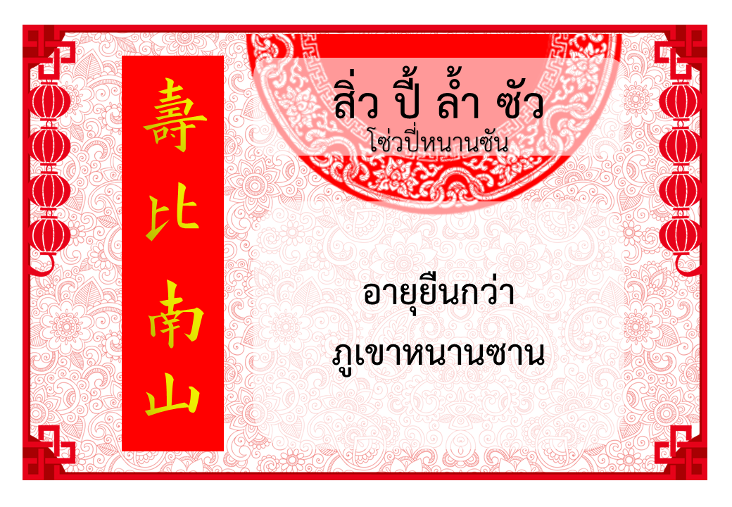 祝你福如东海,寿比南山。 [zhùnǐfúrúdōnghǎishòubǐnánshān] ขอให้มีโชคลาภวาสนามากๆ อายุยืนยาวคำอวยพร